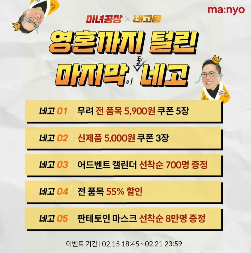 전 상품 구매시 5,900원 쿠폰 5매 제공 * 상품별 1개의 쿠폰만 적용 가능 혜택 2. 신상품 3개 구매시 5,000원 쿠폰, 신상품 5,000원 증정 <3 new products for which coupons apply> 퓨어 클렌징 오일 딥클린 = 5,000원 히아루로닉 하이드레이팅 선스틱 = 5,000원 히아루로닉 하이드레이팅 선크림 = 5,000원 (지정상품별 1개만 적용 가능) 혜택 3. 마스크팩 8만명, 정가 4,000원, 인판테토인 마스크시트 1장, 선착순 8만명 증정 (ID당 1개 증정) 혜택 4. 어드벤트 캘린더 41만원 상당 만요공장 어드벤트 캘린더 700개 선착순 증정 (별도배송, 무료배송) ) 혜택 5. 전품목 55% 할인 이벤트 기간 전 상품 55% 할인 * ID 당 동일 상품 최대 3개 구매 가능 (마스크 최대 10개까지) 전 고객에게 5종 샘플도 증정 네고킹 혜택 기간 및 무료배송 기준기간은 7일(2/15~2/21) * 만요팩토리 공식몰 구매시 * 2만원 이상 무료배송 만요팩토리 서버 폭발 네고킹 영상 이후 6시 45분부터 혜택이 시작되었습니다. 2월 15일, 만요팩토리 공식몰에는 대기줄이 엄청납니다. 하지만 실제 대기시간은 30분 정도인 것으로 전해진다. 만요공장 개요 만요공장 출입문 무제한 생산 만요공장은 협상 기간 동안 품절 없이 구입할 수 있도록 무제한 생산을 약속했다. 배송이 늦어지더라도 품절 걱정 없이 구매하실 수 있습니다. 블랙헤드를 없애기 위해 킬패드를 사용해볼까 생각중입니다. 만요팩토리의 추천상품 베스트 5입니다. 아래 링크 확인↓↓↓↓ 만요팩토리 네고킹 세일 추천상품 TOP 5 순위 위치팩토리 네고킹 세일 전품목을 5,900원에 판매하고 있으니 놓칠 수 없는 기회입니다. 오늘은 개인적으로 너무 마음에 드는 베스트 추천 아이템 5개를 소개해드리고자 합니다. 이 모든 제품은 네고킹 세일 기간에만 할인된 가격으로 구매하실 수 있습니다. appdeals11.com 뷰티기기 순위 메디큐브 에어샷 ATS, 부스터 힐러, EMS, 유세라 딥샷, 아이샷 5종 갈바닉차이, 내맘대로 구매 추천 기기 Money 마이뷰티디바이스 메디큐브 AGR 세트 5개를 모두 내돈으로 0원에 구입해서 8개월간 사용했습니다. 아이샷… m.blog.naver.com