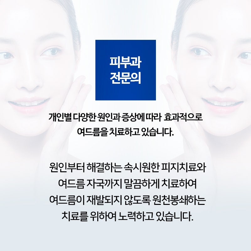 많은 여드름 피부과와 여드름클리닉을 방문해 주셨으나 아무런 효과를 보지 못하신 분들이 많습니다. 많은 여드름 병원이 겉으로 드러나는 여드름 치료에만 집중하기 때문이다. 환자 개개인의 여드름의 근본 원인을 파악하고, 이를 해결하기 위한 여드름 치료를 진행합니다.