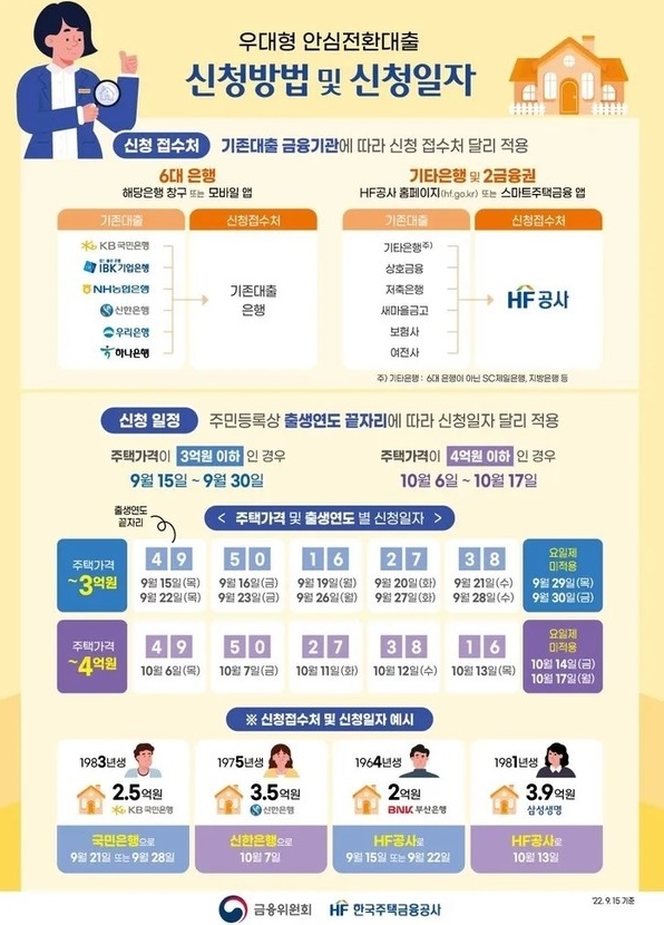 지난 9월 15일부터 시작됐으며, 6개 주요 은행과 한국주택금융공사에서 신청할 수 있다. 주택 가격이 높은 순으로 먼저 지원을 받으므로 신청 가능한 날짜를 확인하시기 바랍니다. 신청기간은 주택가격 3억원 이하이다. 9월 15일부터 28일까지이고, 주택가격 4억원 미만은 10월 6일부터 13일까지다.