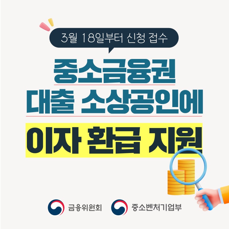 안녕하세요~ 놓치기 쉬운 정부정책을 알려드리는 쑥떡입니다. 요즘은 자영업을 하는 소상공인들이 많을 텐데요. 우리는 사업 대출 이자 비용으로 어려움을 겪는 사람들을 종종 봅니다. 높은 인플레이션과 높은 이자율로 인해 불가피한 선택이었다고 생각합니다. 정부는 소상공인의 대출이자 부담을 완화하기 위해 올해 초 이자환급정책을 발표했다. 다만 시중은행을 대상으로 한 것이기 때문에 다른 금융기관으로부터 대출을 받은 소상공인들이 환급을 받지 못해 다소 불공정한 상황이 발생했다. 정부는 이러한 불합리성을 인지하고 중소기업 금융기관 대출을 활용해 소상공인에 대한 금융비용 지원도 실시하겠다고 밝혔다. 최대 150만원까지 환불이 가능합니다. 조건과 신청방법을 자세히 살펴보겠습니다. 중소금융기관 이자환급금융비 지원사업이란? 중소금융기관으로부터 일정 금리로 기업대출을 받은 소상공인, 자영업자에게 이자지원을 해주는 사업입니다. 먼저 조건과 목표를 살펴보자. 새마을금고, 농협, 수협, 신협, 저축은행, 산림조합, 신용카드사, 캐피탈사 등에서 대출을 받은 차주여야 합니다. 모든 금리가 지원되는 것은 아니며, 이자율은 5% 이상 7% 미만입니다.