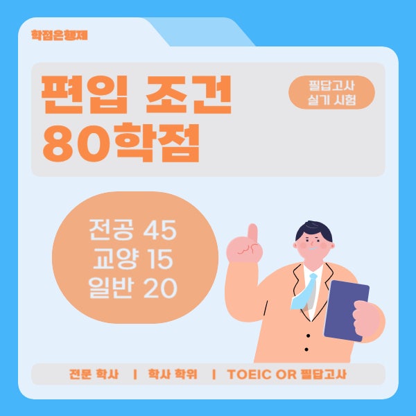 선생님께서는 체육학과로의 편입에 대해 자세히 설명하셨습니다. 3학년 1학기에 4년제 정규대학에 입학하기 위한 입시였다고 하더군요. 대학입시나 학교 성적을 반영하지 않아 성적이 낮거나 고졸자는 지원이 불가능했다. 활용하면 좋은 방법이라고 하더군요. 일반전형과 학사전형을 통해 지원이 가능하며, 각각 일정한 자격을 요구한다고 말했다. 일반적으로 전문대학을 졸업하거나 이에 준하는 학점을 가지고 있어야 하며, 학사의 경우 4년제 졸업장 소지자가 지원 가능합니다. 그들은 내가 할 수 있다고 말했다. 학교를 자퇴했기 때문에 사실상 고졸과 똑같았고, 처음부터 지원조건을 맞춰야 했습니다.