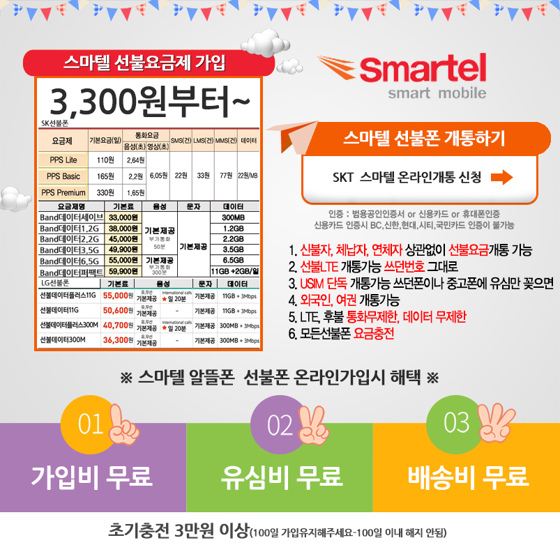 라온선불폰 buly.kr 1. LG 선불폰 특징 및 장점 (선불) 선불은 금액을 선불로 결제한 후 통신 기능을 이용할 수 있는 충전식 운용방식입니다. 선불 방식이기 때문에 후불 방식에 비해 자산 관리가 용이하고, 연체나 정지로 인해 통신이 두절되더라도 서비스를 이용할 수 있는 장점이 있습니다. 더 많은 강점을 함께 살펴볼까요? 3대 통신사 선불폰과 통화 품질 및 속도가 동일합니다. 계약/취소 수수료가 없는 무료 시스템입니다. 현재 장치의 사용. 연체/미납이 없습니다. 자신의 이름 번호를 생성합니다. 비대면 신청으로 당일 처리 OK. 2. 비대면 신청이 필요합니다. USIM은 편의점에서도 쉽게 구입할 수 있습니다. 할 수 있다. 다만, 신청하시는 통신사에 맞는 상품을 선택하셔야 합니다. KT 제휴 USIM을 이용하시려면 이마트24, CU에서 구매 가능한 SIM 카드를 구매하시면 됩니다. 가격은 8,800원이며 NFC 기능이 포함돼 있어 대중교통과 모바일 결제 등에 활용 가능하다. LG제품은 모든 편의점에서 취급하고 있습니다. (U+ 마크)가 인쇄된 제품 또는 일반 SIM 칩(모두 원칩)을 선택하세요. 단, Hello Vision 모델은 호환되지 않습니다. USIM 가격은 4,400원~8,800원이며, NFC 기능 내장 여부에 따라 가격 차이가 있다. KTLG CU / E-Mart 24 (바로 SIM 카드만 인식) 편의점 전체 U+ 로고 (A-Mobile 제외) KT 무료폰과 호환되지 않음 기존 통신사의 무료폰에서 사용 가능 3. LG 선불폰 개통 절차 요약 주말 및 공휴일 포함 공휴일 오전 9시 ~ 오후 8시 크게 두 가지 오픈 과정이 있습니다. 센터방문 온라인 신청 센터방문 온라인 신청 스마트폰, 신분증, 현금(USIM, 수수료) 스마트폰, 신분증, 전자서명, U SIM