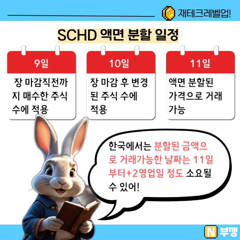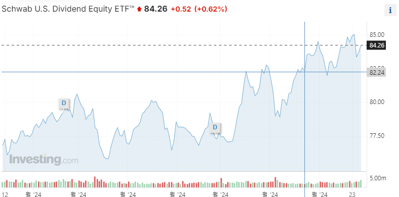주식분할의 의미 주식분할은 회사가 기존 주식을 여러 주식으로 분할하는 것을 의미합니다. 예를 들어, 1대2 주식 분할에서 1주를 소유한 주주는 이제 2주를 소유하게 되고 주가는 절반으로 삭감됩니다. 주식 분할의 주요 특징: 주식 수의 증가: 기존 주식의 수가 증가합니다. 주가하락 : 분할비율에 따라 주식의 액면가가 하락합니다. 시장 가치는 변하지 않습니다: 회사의 전체 시장 가치, 즉 시가 총액은 동일하게 유지됩니다. 주식분할의 목적은 주가를 낮추고, 더 많은 투자자들이 주식에 접근할 수 있도록 하며, 거래 유동성을 높이는 것입니다. SCHD 주식분할 일정 및 주식분할 후 주가 SCHD 주식분할 일정 기준일: 2024년 10월 9일(미국 장 마감일) 지급일: 2024년 10월 10일(미국 장 마감 후) 거래 시작일: 2024년 10월 11일 (분할 후 주로 거래 시작) 본 일정에 따라 SCHD의 주식분할은 3:1 비율로 진행됩니다. SCHD 주식분할 후 주가 SCHD의 주식분할은 3:1 비율로 진행되므로 현재 주가는 84.65달러이다. 이를 바탕으로 분할 후 주가는 약 28.22달러가 됩니다. 자산운용사별 한국판 SCHD 비교 다음은 국내 시장에서 SCHD와 동일한 Dow Jones US Dividend 100 Index를 추종하는 ETF 비교표이다.